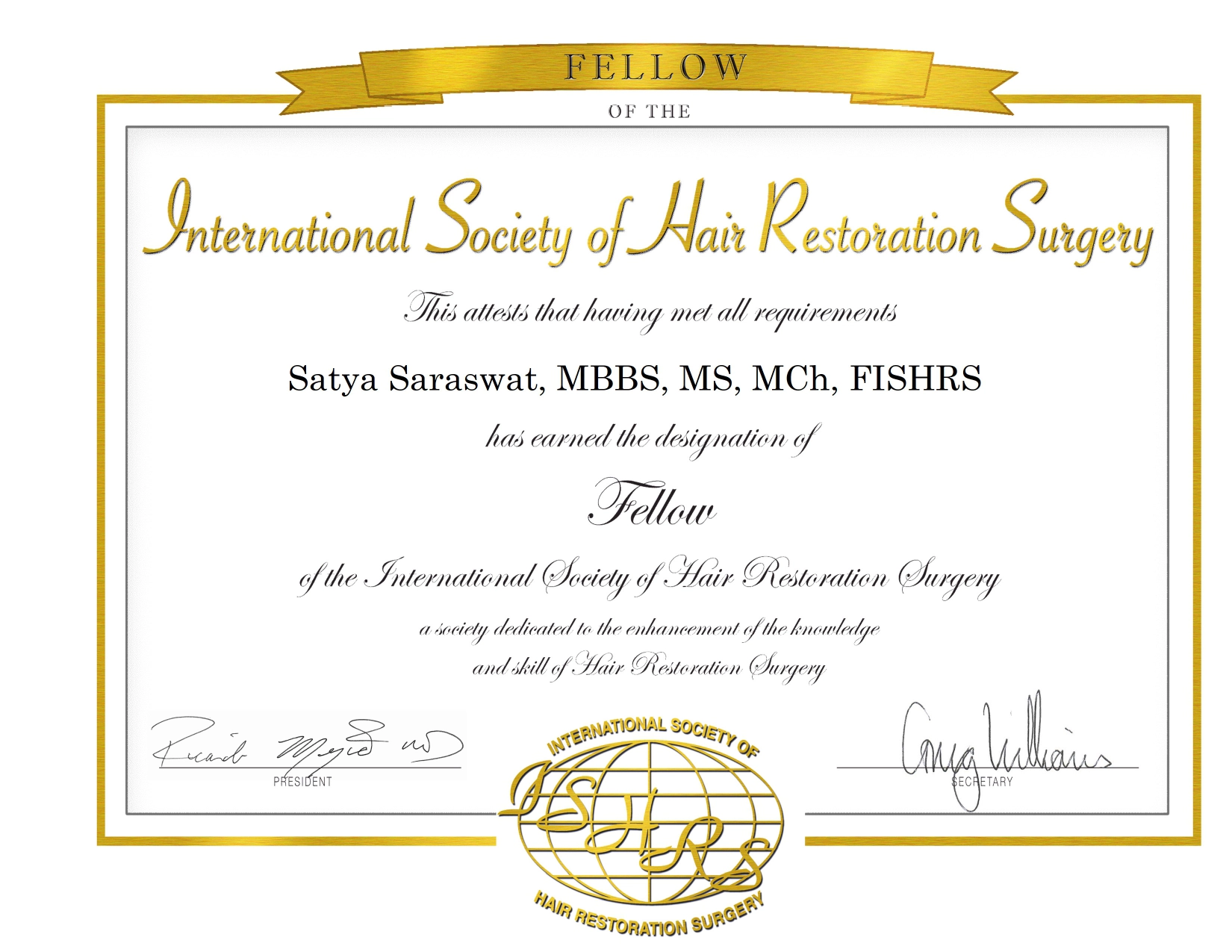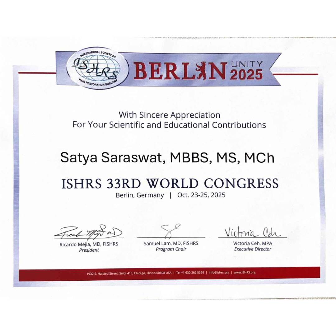 Dr. Satya Saraswat has also earned the designation of Fellow of the International Society of Hair Restoration Surgery (FISHRS).