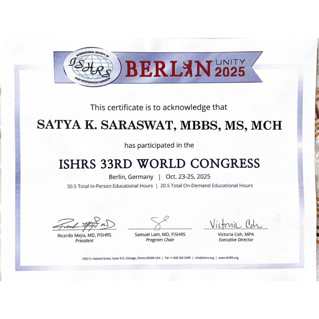 The International Society of Hair Restoration Surgery (ISHRS) awarded Dr. Satya Saraswat with a certificate for his participation in the live activity of the ISHRS 23rd Annual Scientific Meeting in Chicago, USA.
