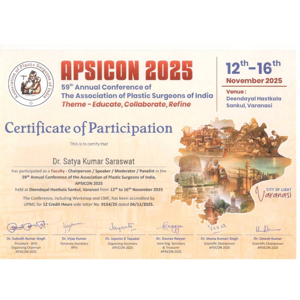 Dr. Satya Saraswat was awarded the certificate for participating in the 43rd Annual Conference of the Association of Plastic Surgeons of India, held at Varanasi, India, in APSICON 2008.